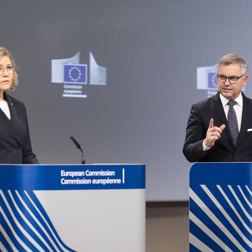 Vicepreședinta executivă Henna Virkkunen și comisarul Magnus Brunner la prezentarea ProtectEU, noua agendă a Comisiei Europene pentru prevenirea și combaterea terorismului, axată pe radicalizarea online, tehnologii emergente și cooperarea cu platformele.