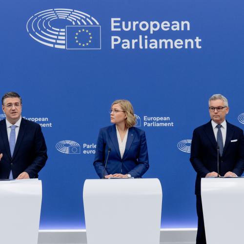 Apostolos Tzitzikostas (stânga), Henna Virkkunen (centru) și Magnus Brunner (dreapta) în timpul conferinței de presă privind Planul de acțiune pentru securitatea dronelor și contracararea dronelor, la Parlamentul European din Strasbourg.