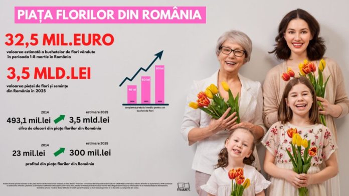 Conform unei analize realizată de Frames, piața florilor din România ar putea atinge un record istoric, în acest an, de peste 3,5 miliarde de lei, pe fondul creșterii semnificative a vânzărilor și a diversificării afacerilor din acest sector. Pentru marea majoritate a florarilor, 1 și 8 martie reprezintă vârful vânzărilor, cu un business evaluat la peste 30 de milioane de euro.