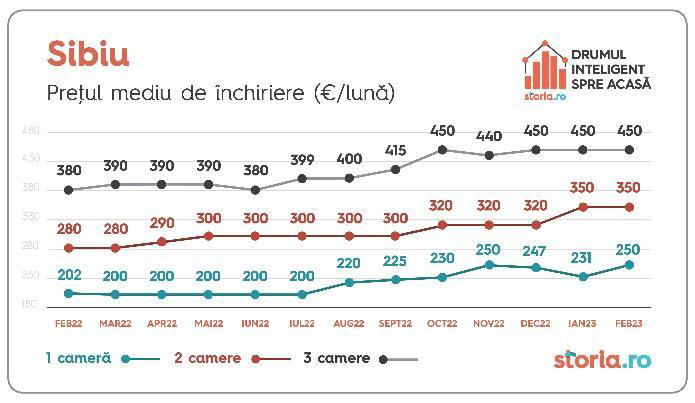 Deși prețul mediu al chiriilor la apartamentele cu o cameră scăzuse în luna ianuarie, în februarie s-au observat creșteri în această categorie, de 8%. În același timp, chiriile medii la apartamentele cu două și trei camere au stagnat.