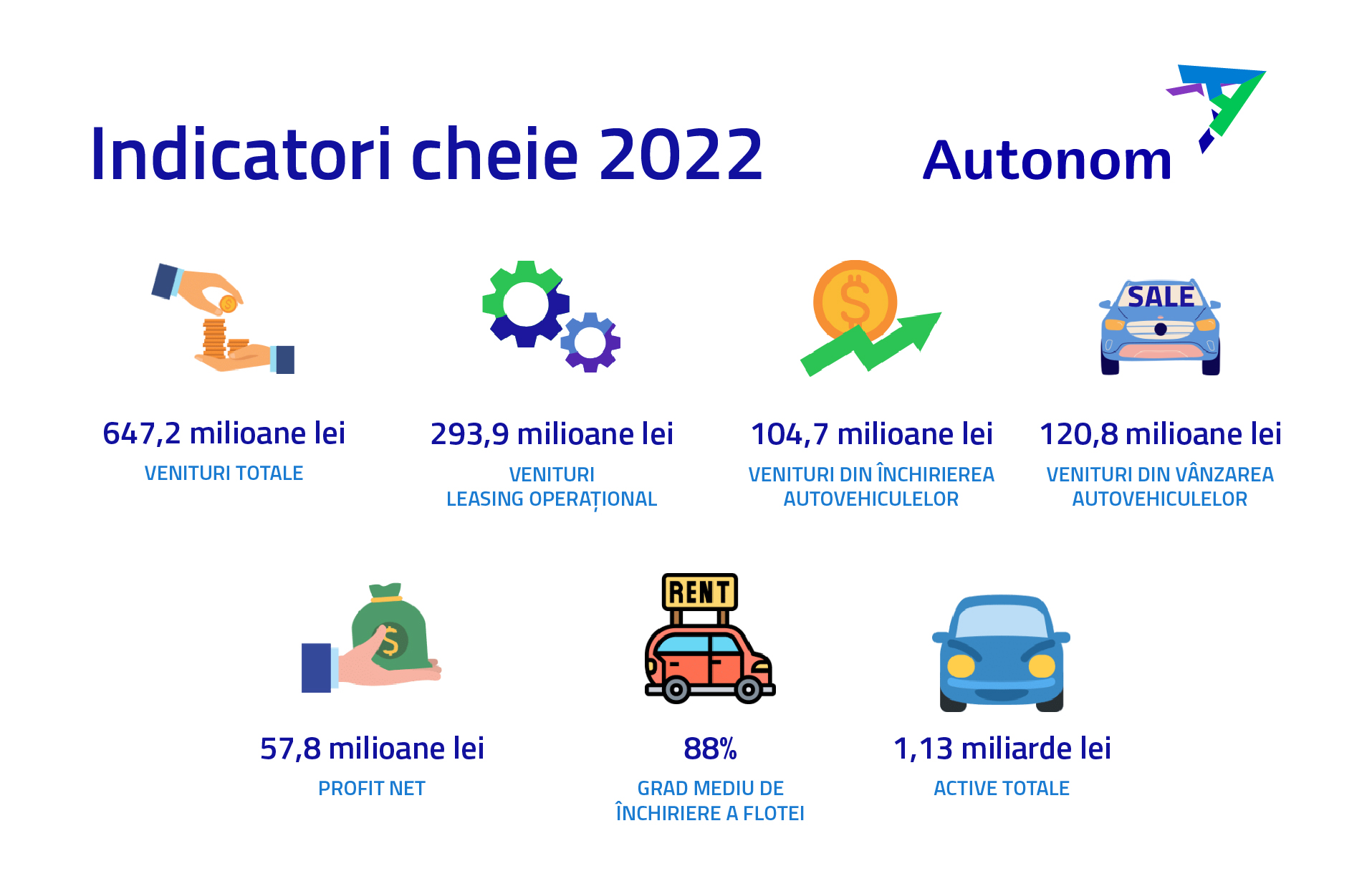 Autonom Services SA, cea mai extinsă rețea de mobilitate din România, raportează cel de-al 16-lea an consecutiv de creștere de la înființare, cu o creștere anuală medie compusă (CAGR) de 51%. Cu majorări de peste 50% a veniturilor pe toate liniile principale de business, Autonom a înregistrat venituri totale de 647.2 milioane lei, în creștere cu 64% și un profit net de 57.8 milioane lei. Totodată, activele imobilizate au crescut cu 68%, depășind pentru prima dată un miliard de lei, iar valoarea flotei de închiriere a înregistrat o creștere de 115%, ajungând la 597,8 milioane de lei.