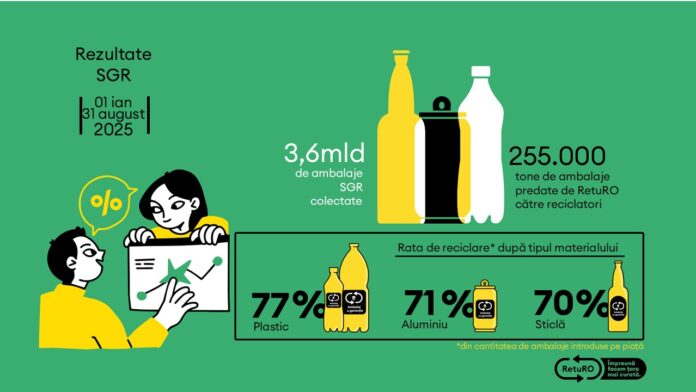 În luna august, Sistemul de Garanție-Returnare a atins un prag important: volumul ambalajelor returnate de la începutul acestui an a depășit totalul înregistrat pe parcursul întregului an 2024, ceea ce arată că returnarea ambalajelor SGR a devenit o practică uzuală în rândul românilor. Astfel, în primele opt luni din 2025, românii au returnat aproximativ 3,6 miliarde de ambalaje, iar RetuRO a predat către reciclatori peste 255.000 de tone de materiale – PET, aluminiu și sticlă.