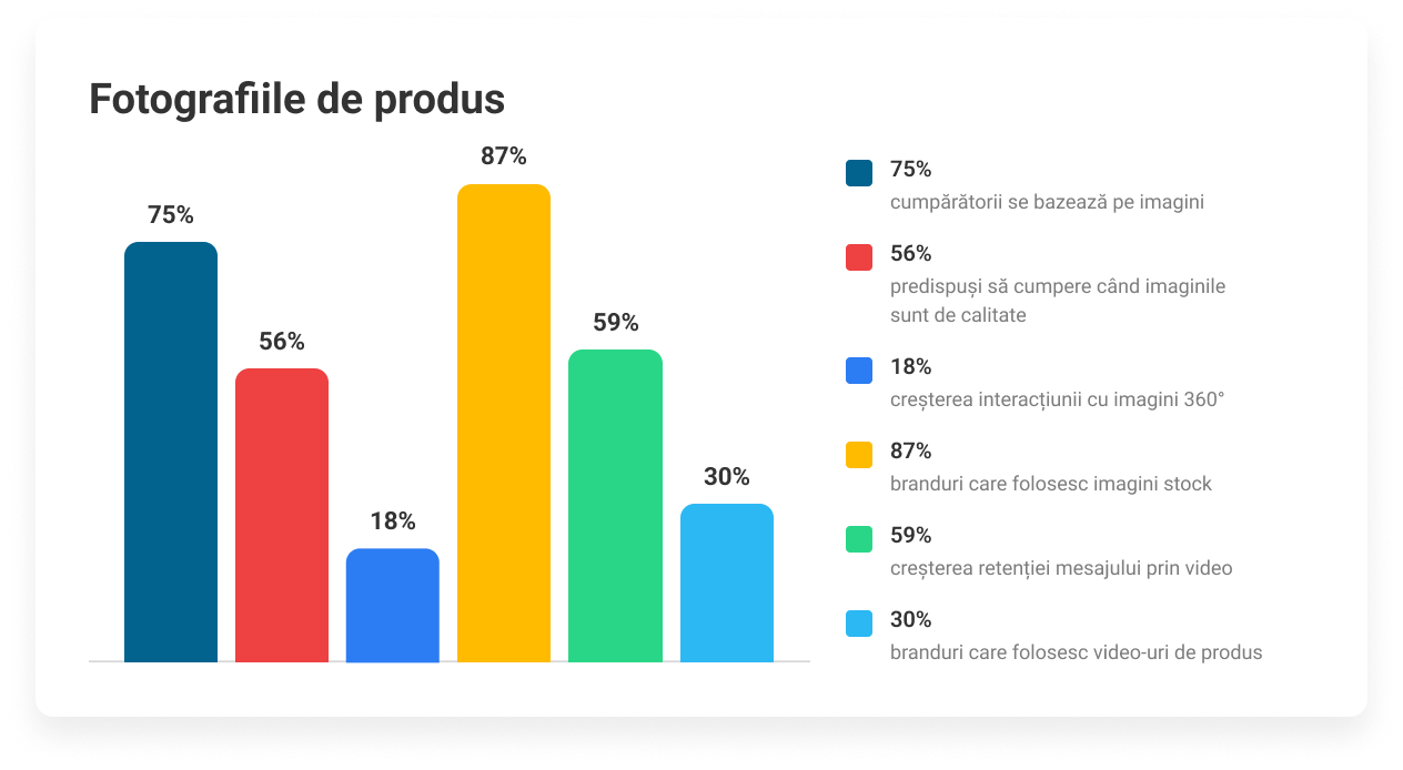 75% dintre cumpărătorii online se bazează pe imagini când decid ce achiziționează, iar 56% cumpără mai ușor când fotografiile sunt de calitate. Imaginile 360° pot crește timpul de interacțiune cu produsul cu până la 18%, arătând cât de mult contează experiența vizuală.