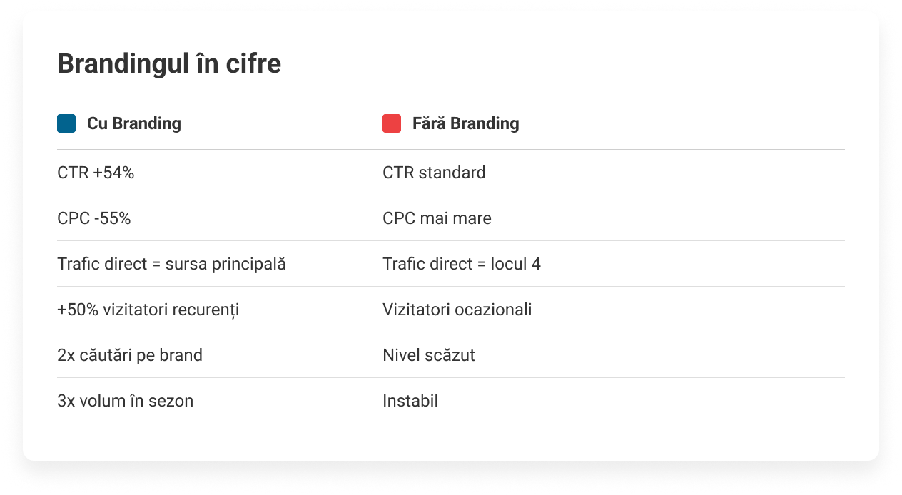 - CTR și CPC: campaniile cu branding au avut un CTR cu peste 54% mai mare și un CPC cu 55% mai mic .
