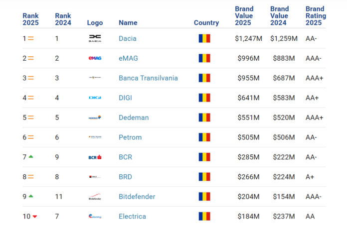Dacia rămâne cel mai valoros brand românesc, în ciuda unei scăderi de 5% a valorii de brand, ajungând la 1,1 miliarde EUR, potrivit unui nou raport al Brand Finance, liderul mondial în evaluarea valorii brandurilor.