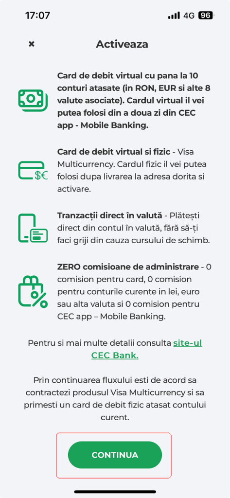 Astfel, clienții CEC Bank noi sau existenți pot accesa fluxurile de contractare disponibile în ecranul de activare a CEC app, imediat după descărcarea şi instalarea aplicaţiei din magazinele virtuale, App Store (iOS), Google Play (Android) şi Huawei AppGallery.