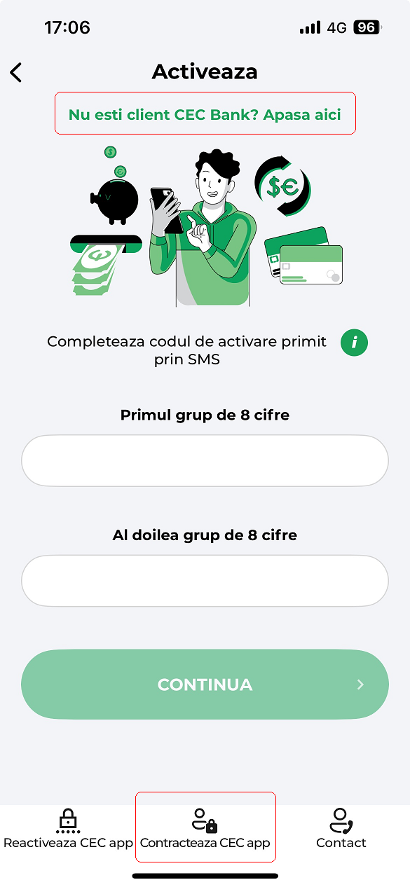 - clienții CEC Bank existenti (care detin alte produse din portofoliul bancii) pot accesa butonul “Contractează CEC app”, disponibil în bara orizontală de navigare din partea de jos a ecranului.