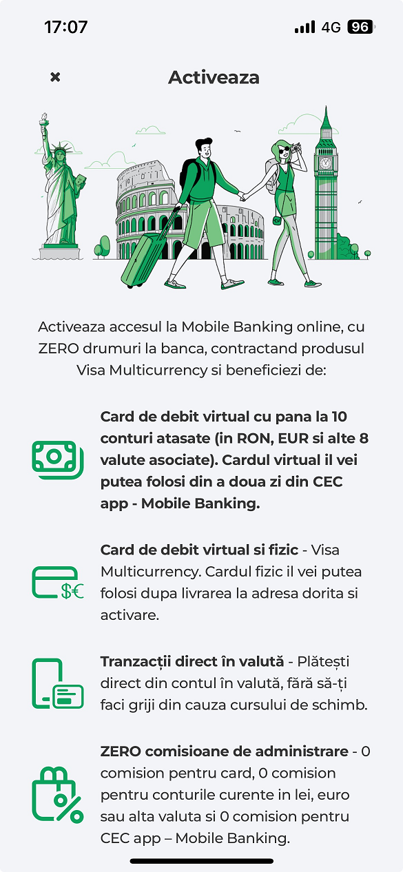Activarea accesului la Mobile Banking se realizează în urma contractării pachetului Visa Multicurrency.