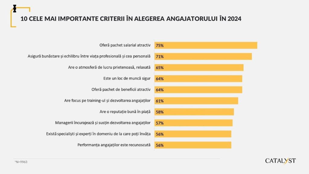 Pe lângă topul Celor mai doriți angajatori, rezultatele studiului oferă și informații valoroase pentru profesioniștii de HR și EB cu privire la opiniile și comportamenul candidaților actuali din piața muncii. De exemplu, criteriile ce stau la baza deciziei în alegerea angajatorului dorit. Al treilea an consecutiv, principalul criteriu ales de către respondenți este pachetul salarial atractiv. În 2024, respondenții au menționat echilibrul dintre viața profesională și cea personală într-un procent de 71% față de 44% de anul trecut. Astfel că, și atmosfera de lucru prietenoasă și relaxantă fiind mai apreciată anul acesta (65% față de 45% anul trecut).