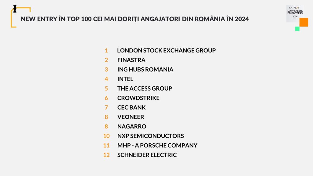 Lansat pentru prima dată anul acesta, Top New Entry este un clasament al companiilor care se regăsesc în premieră în top 100 Cei mai doriți angajatori. În Top New Entry sunt companiile care s-au remarcat în 2024, organizații care au reușit să atragă atenția prin practici de management, cultură organizațională sau beneficii oferite angajaților și astfel să se poziționeze ca un angajator de top în România.