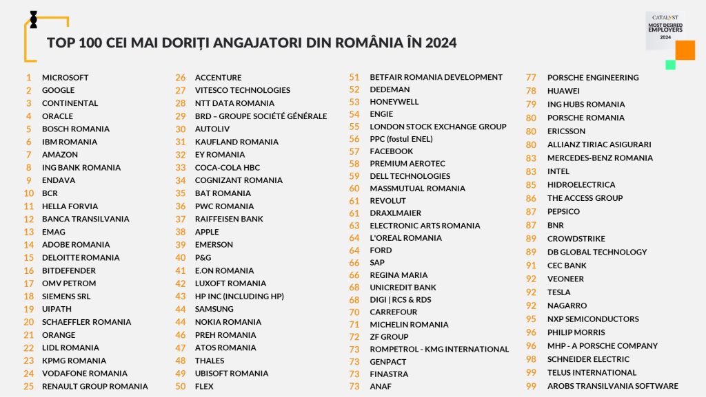 Pentru al 19 an consecutiv, studiul Cei mai doriți angajatori a fost realizat la nivel național, pe baza a 10 981 de răspunsuri libere, neasistate ale respondenților. Top 100 Cei mai doriți angajatori este un clasament realizat în baza răspunsurilor libere și neasistate la întrebarea: „Care este topul primilor 5 angajatori pentru care îți dorești să lucrezi?“ Dimensiunea organizației, distribuția geografică sau diversitatea de roluri deschise de o organizație pot fi câteva dintre aspectele care contribuie la numărul mare de nominalizări ca cel mai dorit angajator.