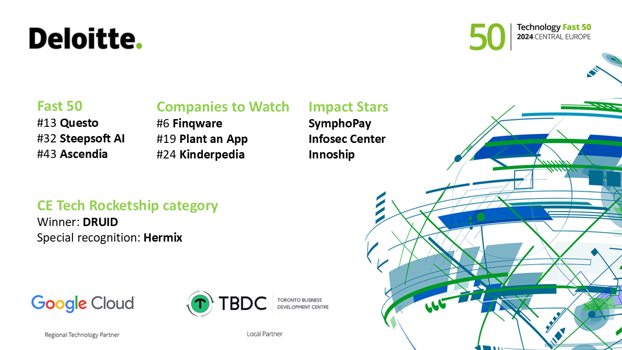 Recunoașterea specială CE Tech Rocketship, oferită de Google Cloud, partenerul de tehnologie la nivel regional al programului Deloitte Technology Fast 50 Europa Centrală, îi revine start-upului românesc DRUID, specializat în dezvoltarea de asistenți virtuali inteligenți dedicați proceselor complexe din organizații. De asemenea, Google Cloud a oferit o recunoaștere specială în cadrul acestei categorii companiei locale Hermix, care a dezvoltat o platformă care ajută companiile să cunoască oportunitățile de business din sectorul public prin automatizarea activităților de marketing pentru zona business-to-government, a celor de vânzare și de pre-vânzare, precum și de participare la licitații publice.