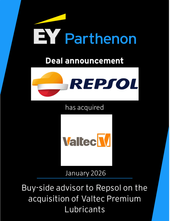 Echipele EY Parthenon (EYP) din România și Spania au consiliat Repsol, o companie globală de energie activă pe întreagul lanț de valoare din industria de petrol și gaze, în achiziția Valtec Premium Lubricants, un distribuitor important de lubrifianți auto și industriali, ca parte a unui nou joint venture format cu Valtec B.V.