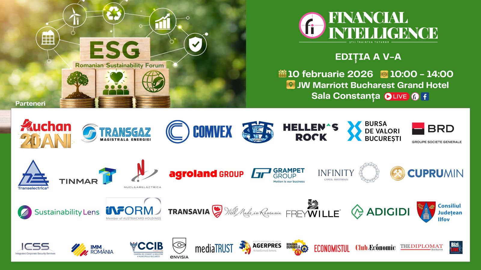 București, 09 februarie 2026. Financial Intelligence organizează mâine, 10 februarie 2026, a cincea ediție a evenimentului “ROMANIAN SUSTAINABILITY FORUM”. Evenimentul va putea fi urmărit și online, LIVE, pe www.financialintelligence.ro, pe pagina de Facebook Financial Intelligence și pe canalul de Youtube Financial Intelligence.