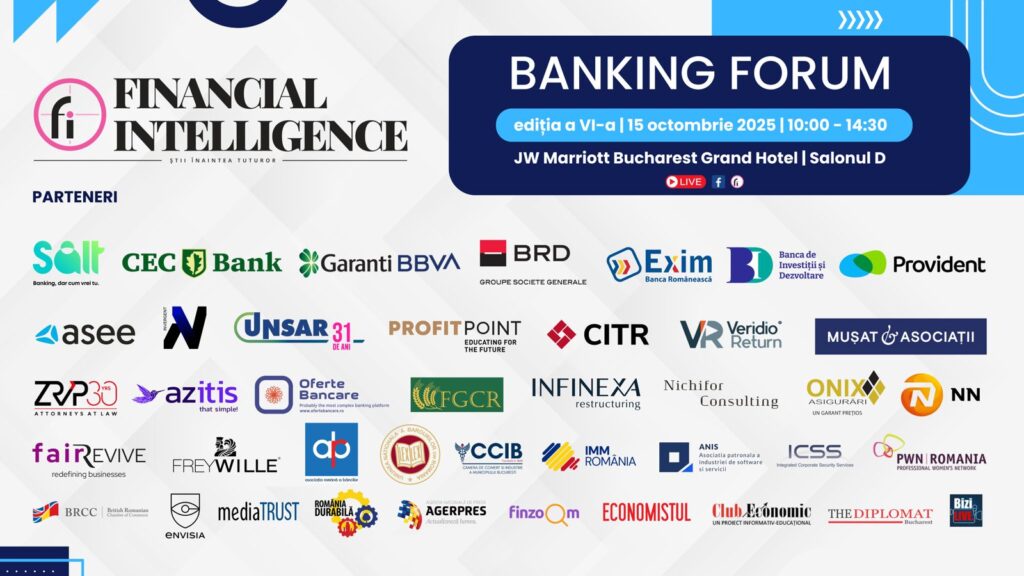 Financial Intelligence organizează miercuri, 15 octombrie 2025, de la ora 10:30, cea de-a cincea ediție a evenimentului BANKING FORUM, la JW Marriott Bucharest Grand Hotel. Evenimentul va putea fi urmărit și online, LIVE, pe www.financialintelligence.ro, pe pagina de Facebook Financial Intelligence și pe canalul de Youtube Financial Intelligence.