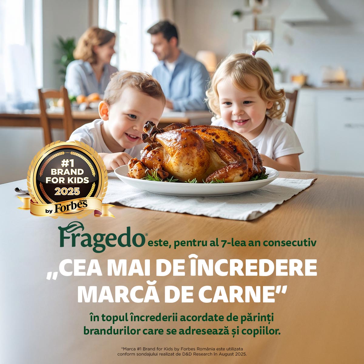 Astăzi, această încredere primește o nouă recunoaștere publică: Forbes România desemnează Fragedo drept „#1 Brand for Kids”, „cea mai de încredere marcă de carne (pui, porc, vită etc.)”, pentru al șaptelea an consecutiv, în urma unui studiu realizat împreună cu Institutul D&D Research[1]. Este un premiu care nu vorbește despre notorietate, ci despre calitate consecventă, un criteriu esențial în piața alimentară și cu atât mai important atunci când vorbim despre copiii noștri.