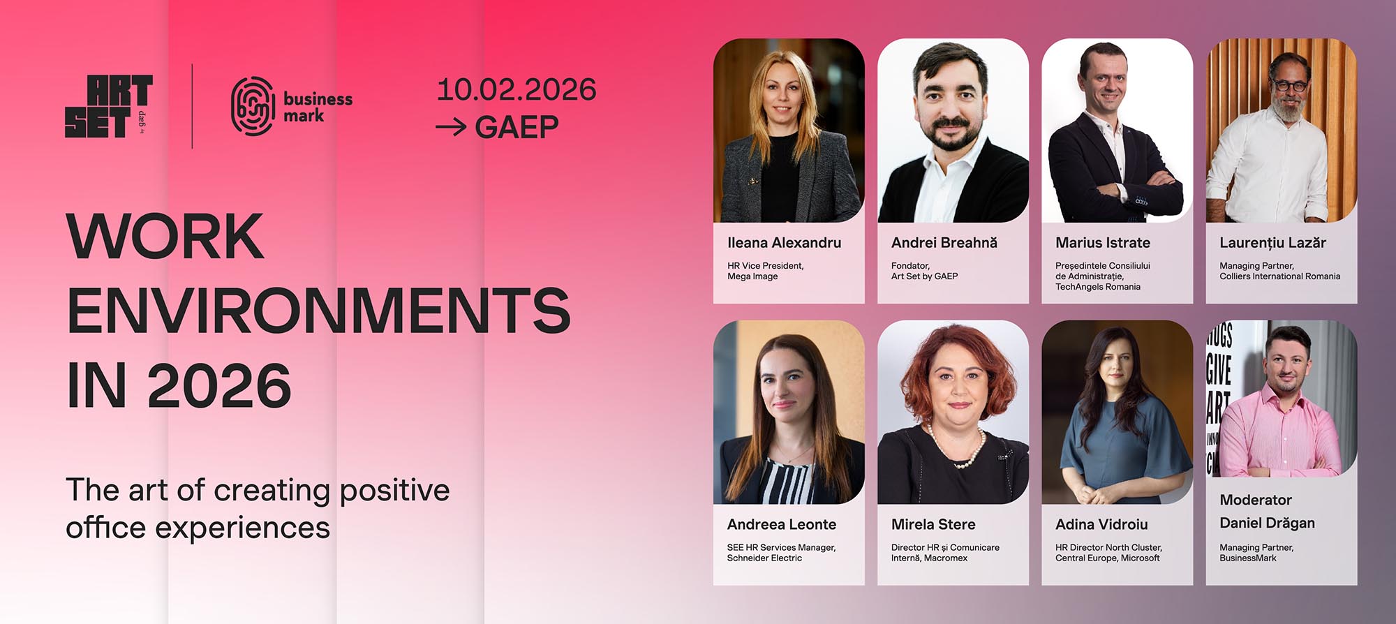 Evenimentul „Work Environments in 2026” este organizat de BusinessMark și Art Set by GAEP și va avea loc la galeria de artă contemporană GAEP, în intervalul 09:30 – 14:00. Va începe cu un tur ghidat în galerie, iar punctul central al zilei va fi o activitate artistică personalizată, menită să îmbogățească discuția despre implicare și lucrul în echipă.