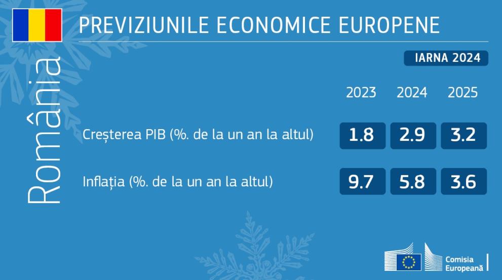Ca urmare a creșterii modeste de anul trecut, economia UE a intrat în 2024 cu un nivel mai redus decât se preconizase. În previziunile sale intermediare din iarnă, Comisia Europeană revizuiește creșterea din UE și din zona euro în sens descendent, după cum urmează: 0,5 % în ambele zone în 2023 (față de 0,6 %, potrivit previziunilor din toamnă), 0,9 % în UE (față de 1,3 %) și 0,8 % în zona euro (față de 1,2 %) în 2024. În 2025, previziunile de creștere a activității economice se mențin totuși la 1,7 % pentru UE și la 1,5 % pentru zona euro.