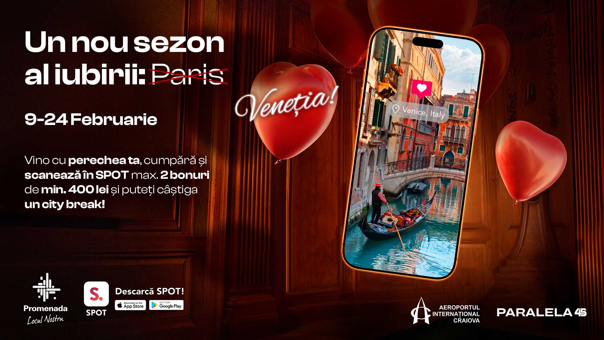 Luna iubirii vine cu o experiență memorabilă la Promenada Craiova, în perioada 09-24 februarie. Centrul comercial le oferă șansa cuplurilor să câștige un city break romantic la Veneția, orașul gondolelor, o destinație care a cucerit recent și ecranele, odată cu noul sezon al celebrului serial Emily in Paris.