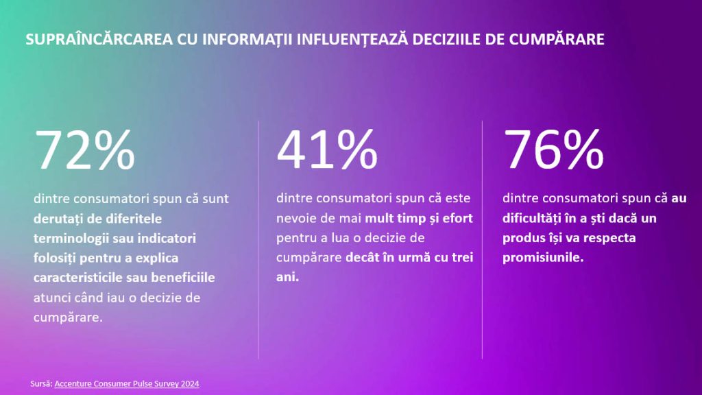 Majoritatea consumatorilor (72%) se simt copleșiți de prea multe opțiuni în momentul în care trebuie să ia o decizie de cumpărare, ceea ce a dus la abandonarea cumpărăturilor de către 74% dintre ei, în ultimele trei luni ale anului 2023, conform unui studiu Accenture. Studiul, bazat pe un sondaj realizat pe un eșantion de 19.000 de consumatori din 12 țări, evidențiază problema „supraîncărcării cu informații”.