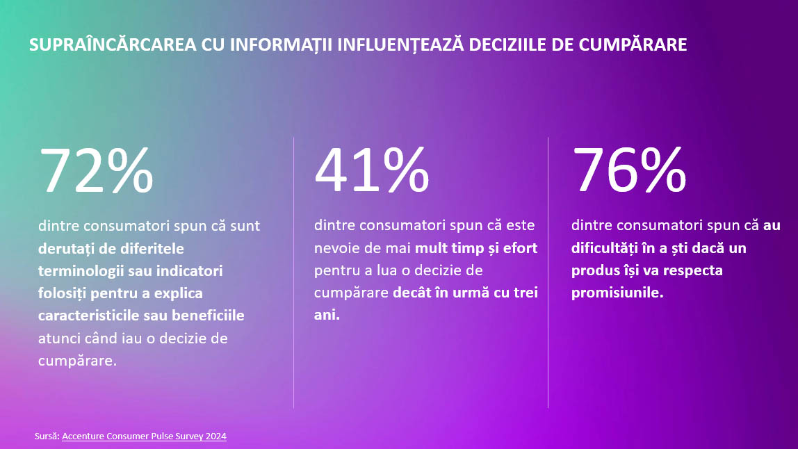 Majoritatea consumatorilor (72%) se simt copleșiți de prea multe opțiuni în momentul în care trebuie să ia o decizie de cumpărare, ceea ce a dus la abandonarea cumpărăturilor de către 74% dintre ei, în ultimele trei luni ale anului 2023, conform unui studiu Accenture. Studiul, bazat pe un sondaj realizat pe un eșantion de 19.000 de consumatori din 12 țări, evidențiază problema „supraîncărcării cu informații”.
