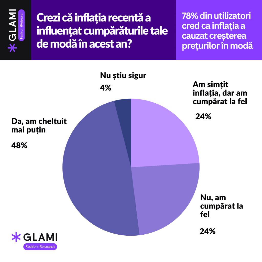 În fapt, 48% dintre participanții la studiu declară că inflația le-a influențat achizițiile fashion, fiind nevoiți să cheltuiască mai puțin pentru îmbrăcăminte și încălțăminte decât înainte. Acționând în consecință, 61% au cumpărat mai puțin, 36% s-au concentrat pe reduceri, 16% și-au stabilit în avans bugete mai stricte, 12% au optat pentru magazine mai ieftine, 8% s-au orientat către opțiunile second-hand, iar alte câteva procente și-au vândut piese din garderobă ori le-au reciclat.
