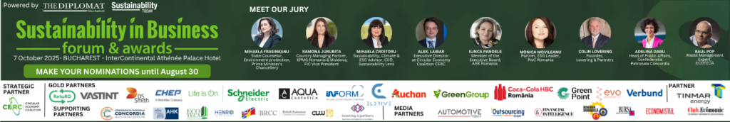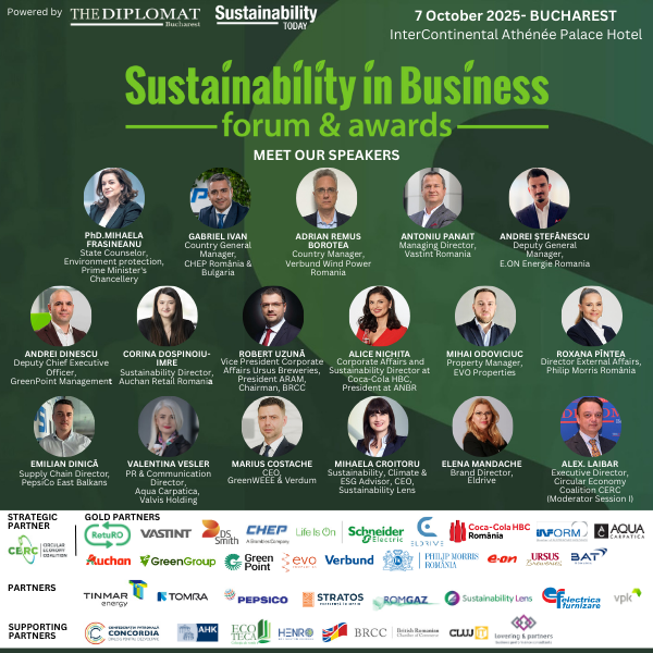 THE DIPLOMAT – BUCHAREST & SUSTAINABILITY TODAY organizează pe 7 octombrie a 6-a ediție a FORUMULUI SUSTENABILITATEA ÎN AFACERI, urmată de GALA PREMIILOR PENTRU SUSTENABILITATE dedicată recunoașterii performanței inițiativelor, proiectelor, companiilor și liderilor din economia din Romania.
