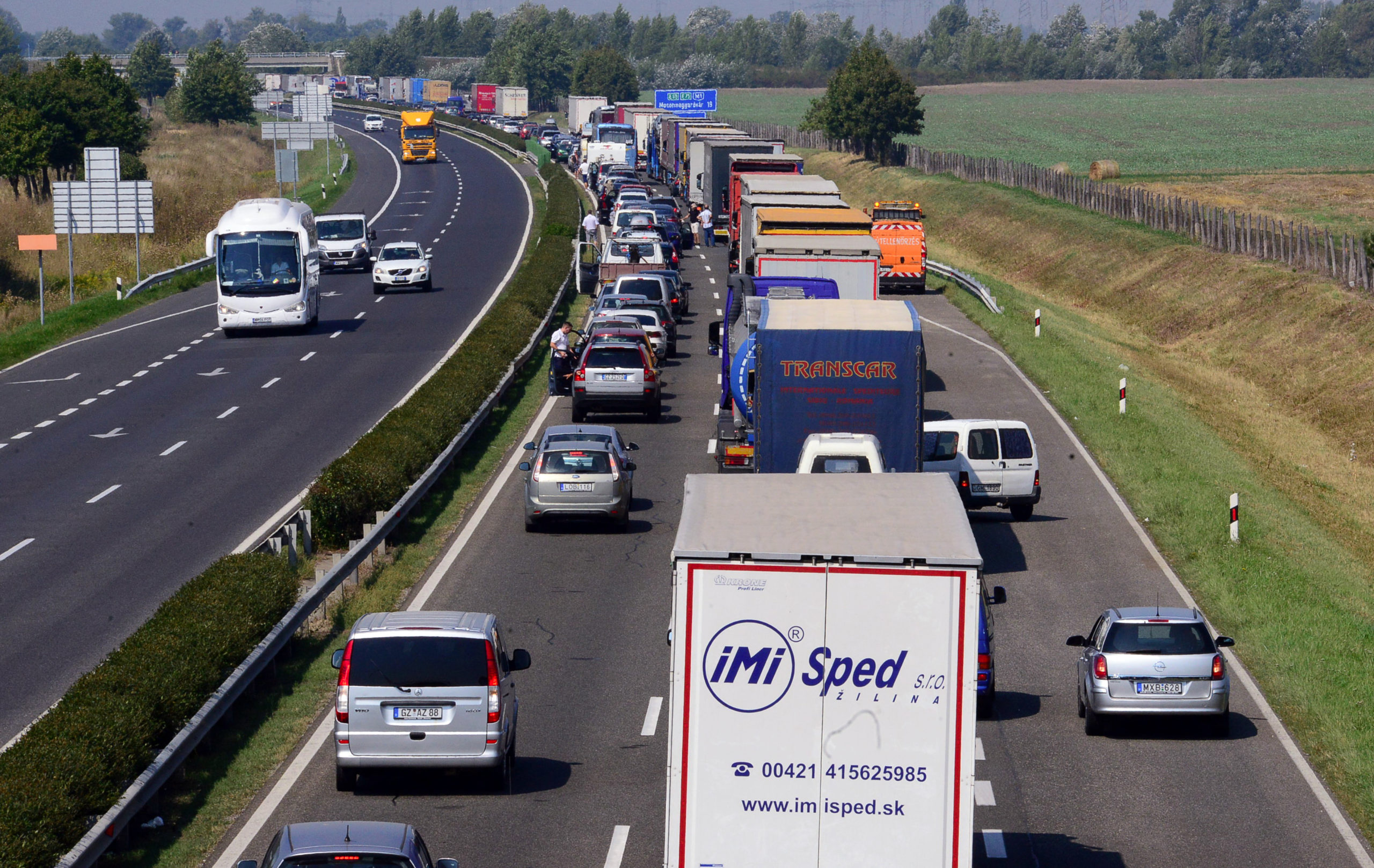 Cars, vans, trucks are stuck in a traffic jam on the M1 highway near the Austrian border in Hegyeshalom on August 31, 2015 as Austrian officials toughened controls along the country's eastern borders, stopping hundreds of refugees and arresting five traffickers in a clampdown that followed last week's gruesome discovery of 71 dead migrants in a truck. AFP PHOTO / ANDRAS BERTLEFF (Photo by Andras BERTLEFF / AFP)
