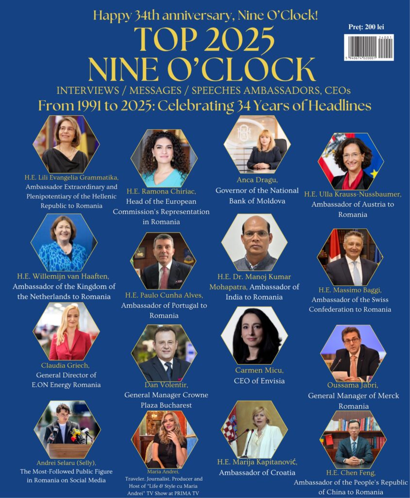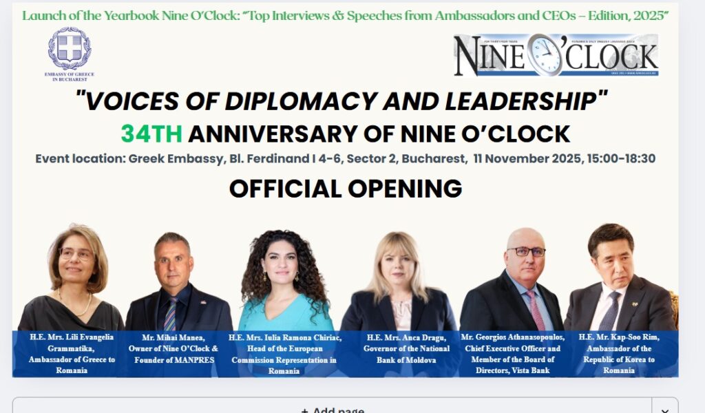 Nine O’Clock, primul ziar de limbă engleză din România, aniversează 34 de ani de excelență în jurnalism și dialog internațional prin organizarea evenimentului de înalt nivel „Vocile Diplomației și ale Leadershipului” și lansarea volumului „Top Interviews, Messages & Speeches from Ambassadors and CEOs – Ediția a II-a, 2025”. Evenimentul este organizat în parteneriat cu Instituția Diplomatică a Republicii Elene la București.