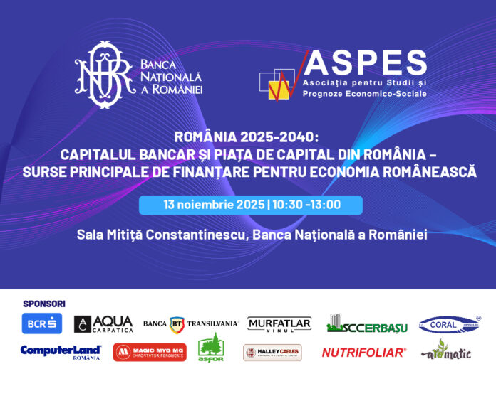 Asociația pentru Studii și Prognoze Economico-Sociale (ASPES), în parteneriat cu Academia Română, Academia de Științe Agricole și Silvice (ASAS), Academia de Studii Economice București (ASE), Asociația Generală a Economiștilor din România (AGER), Asociația Facultăților de Economie din România (AFER), Consiliul Național al Întreprinderilor Private Mici și Mijlocii, Asociația Oamenilor de Afaceri din România (AOAR) și Camera de Comerț și Industrie a României (CCIR), cu sprijinul Băncii Naționale a României (BNR), are plăcerea de a vă invită să participați la conferința cu tema: „ROMÂNIA 2025-2040: CAPITALUL BANCAR ȘI PIAȚA DE CAPITAL DIN ROMÂNIA – SURSE PRINCIPALE DE FINANȚARE PENTRU ECONOMIA ROMÂNEASCĂ”.