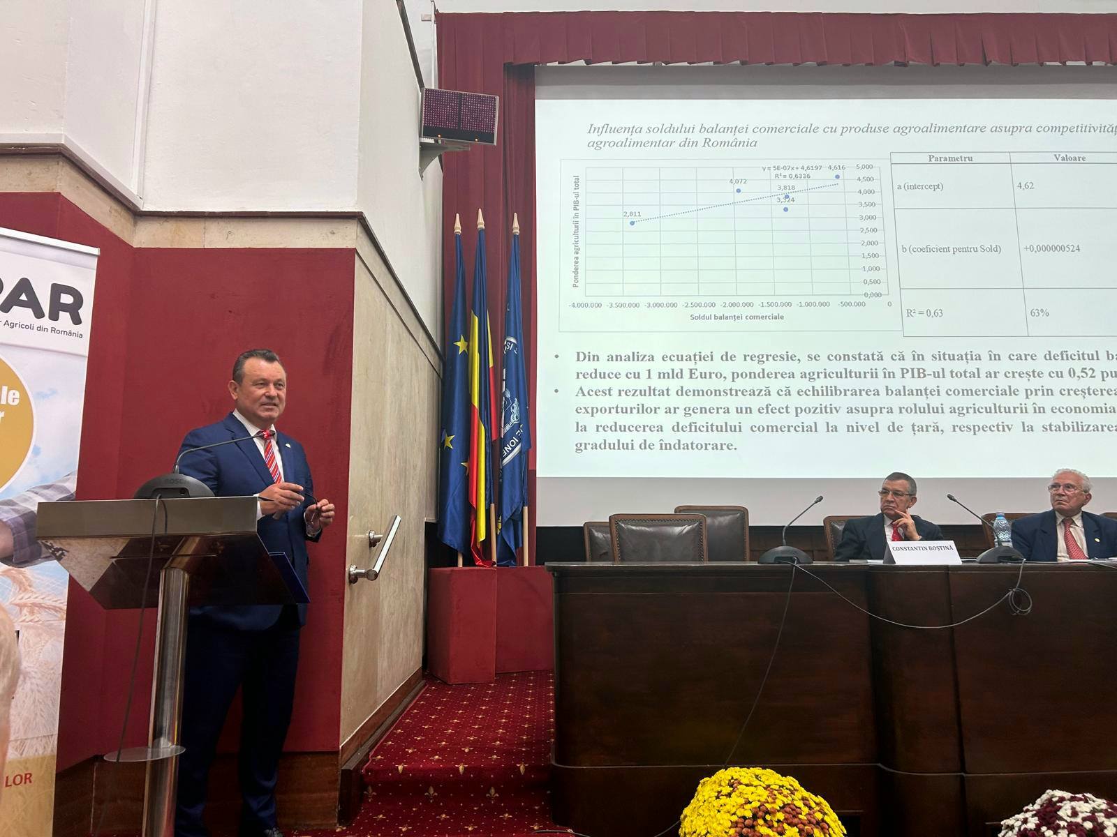 Dacă vrem să evaluăm competitivitatea, trebuie să pornim de la a analiza cu cât contribuie sectorul agroalimentar la PIB, precum și raportul dintre import și export. Constatăm că este o evoluție destul de bună în perioada 2020-2024: o creștere medie de 12%, o creștere susținută. Bine ar fi să fie această creștere pe baza producției interne, nu a importurilor. Evoluția este oscilantă. Anul 2021 a fost un an agricol bun. A înregistrat rezultate favorabile. Din 2022-2024, începem să avem o scădere. Abaterea este mai puțin importantă. Sunt date statistice. Foarte importantă este ponderea agriculturii în PIB-ul total, care înregistrează o scădere de la 4,07 la 2,81. Acum 10-15-20 de ani, era o discuție în Uniunea Europeană, în sensul că țările care au pondere mare în PIB din agricultură sunt țări sărace, slab dezvoltate. De când s-a spus că trebuie să procesăm mâncare din plastic, inflația și creșterea prețurilor la produsele agroalimentare creează posibilitatea ca țările mici să devină importante nu numai în Europa, ci și în lume. Mă gândesc că și-au mai schimbat unii părerea.