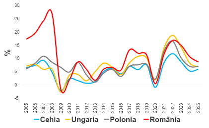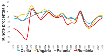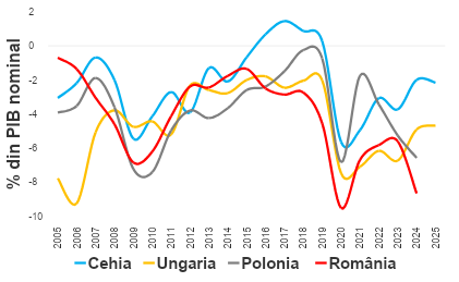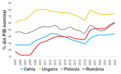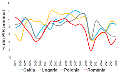 Pentru perioada considerată, 2005-2025, diferențialul ’r–g’ a fost preponderent negativ. Totodată, el crește și poate ajunge în teritoriu pozitiv atunci când creșterea nominală a PIB se reduce semnificativ și poate fi chiar negativă (contracție economică). În cazul țării noastre, diferențialul ’r–g’ s-a situat, în general, sub nivelul înregistrat în cazul celorlalte țări din regiune.