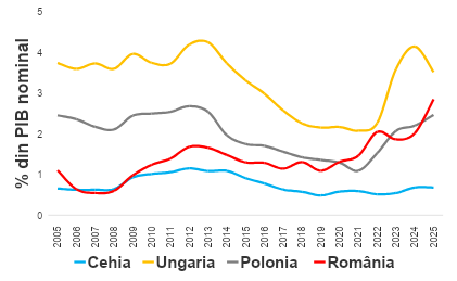 De exemplu, Ungaria are cea mai mare datorie publică din regiune ca pondere în PIB nominal. Acest aspect se reflectă și în evoluția cheltuielilor pentru serviciul datoriei publice. În cazul țării noastre, creșterea abruptă a datoriei publice după izbucnirea pandemiei de Covid-19 a survenit concomitent cu o creștere semnificativă a costurilor cu dobânzile pentru datoria publică. Dacă ne uităm la anul 2022, putem observa că țara noastră a avut o cheltuială cu dobânzile (exprimată ca pondere în PIB) care a depășit-o pe cea a Poloniei, devenind a doua cea mai ridicată din regiune, situație care s-a menținut până în prezent.