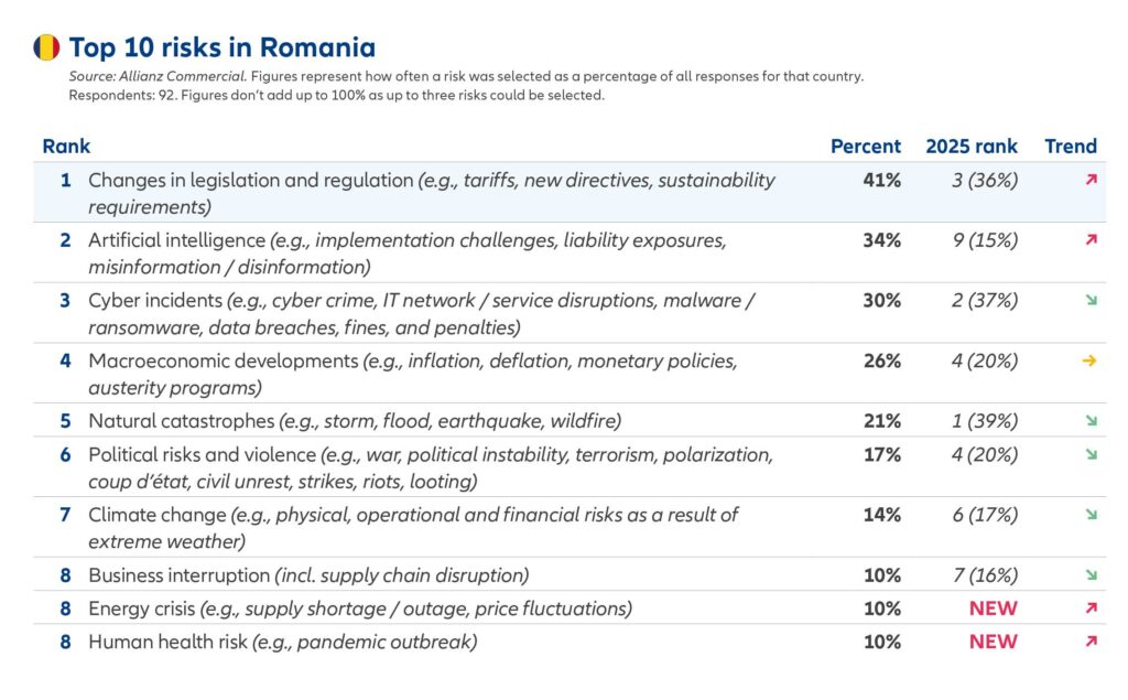 În România, Allianz Risk Barometer 2026 indică un mediu de risc tot mai complex pentru companii, în care schimbările legislative și de reglementare se află în prim-plan. În paralel, inteligența artificială devine un factor-cheie de transformare, generând atât oportunități, cât și riscuri emergente legate de implementare și răspundere. În acest context, AI-ul se situează pe locul 2 în clasamentul riscurilor pentru companiile din România.