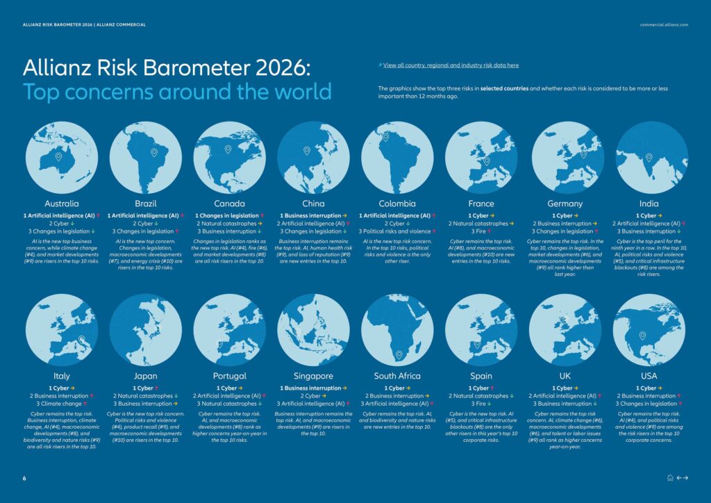 În 2026, incidentele cibernetice reprezintă principalul risc global pentru companii pentru al cincilea an consecutiv, înregistrând cel mai mare scor din istorie (42% din răspunsuri), precum și cea mai mare diferență față de celelalte riscuri (+10%). Acestea se clasează drept principala preocupare corporate în toate regiunile (America, Asia-Pacific, Europa, Africa și Orientul Mijlociu). Menținerea riscurilor cibernetice pe primul loc în Allianz Risk Barometer reflectă dependența tot mai accentuată de tehnologiile digitale, într-un context în care peisajul amenințărilor cibernetice, precum și mediul geopolitic și cel de reglementare, evoluează rapid. Atacurile cibernetice recente, intens mediatizate, subliniază caracterul permanent al acestei amenințări pentru companii de toate dimensiunile. Companiile mici și mijlocii sunt vizate tot mai frecvent și se confruntă cu presiuni crescute, pe fondul resurselor limitate dedicate securității cibernetice.