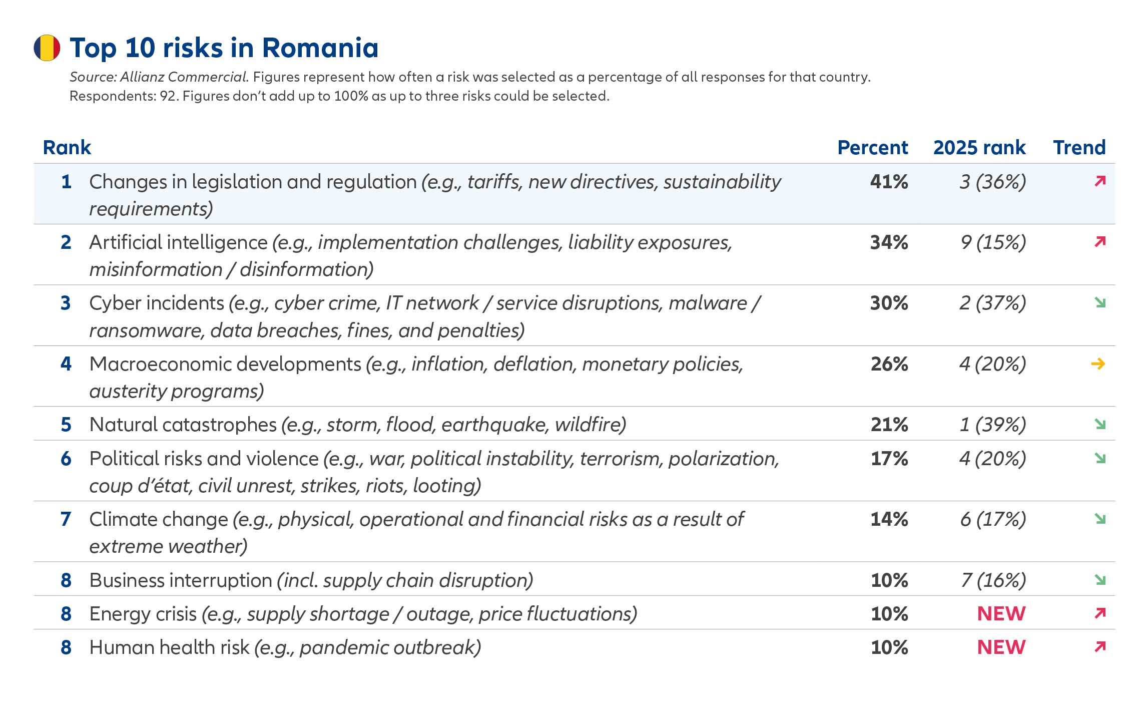 În România, Allianz Risk Barometer 2026 indică un mediu de risc tot mai complex pentru companii, în care schimbările legislative și de reglementare se află în prim-plan. În paralel, inteligența artificială devine un factor-cheie de transformare, generând atât oportunități, cât și riscuri emergente legate de implementare și răspundere. În acest context, AI-ul se situează pe locul 2 în clasamentul riscurilor pentru companiile din România.