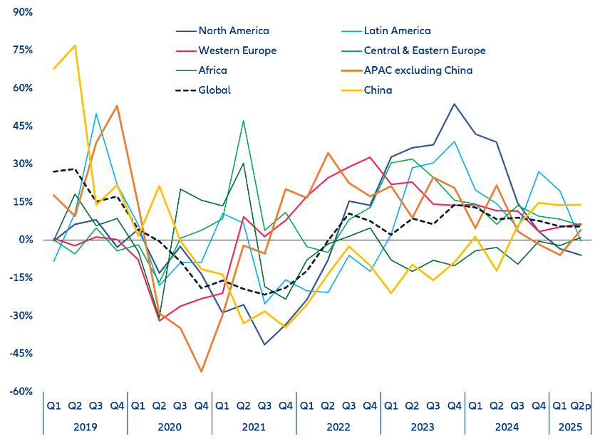 Această perspectivă determină Allianz Trade să își mențină prognoza globală privind creșterea insolvențelor în rândul companiilor pentru anul 2025, estimată la +6%. Aceasta succede unei majorări de +10% în 2024, ceea ce indică faptul că nivelul global al insolvențelor va atinge cel mai ridicat prag din 2019 și se va situa cu aproximativ +19% peste media înregistrată în perioada pre-pandemică. Datele de la începutul anului până în prezent arată deja creșteri semnificative în toate regiunile, în special în Asia (+39%) și Europa de Vest, cu creșteri notabile în Italia (+35%) și Elveția (+26%).