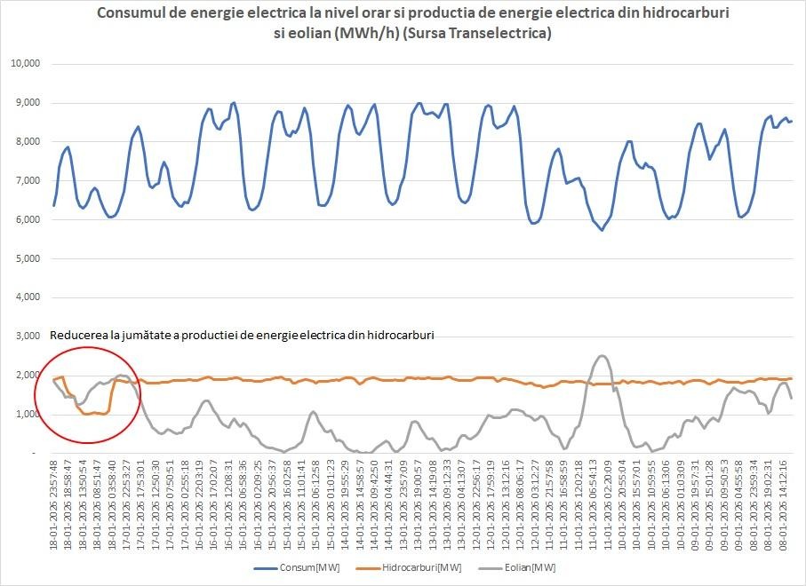 Și aici vine partea pe care nimeni nu ar trebui să o ignore: hidrocarburile folosite pentru producerea de energie electrică au scăzut la jumătate în noaptea 17-18 ianuarie și cu 25% în prima parte a zilei de 18 ianuarie. Nu vorbim de ajustări mici. Vorbim de schimbare de mix cu impact masiv: costuri de producție mai mici, presiune redusă pe piața gazelor, importuri mai mici, emisii mai mici și un sistem care respiră în loc să gâfâie.