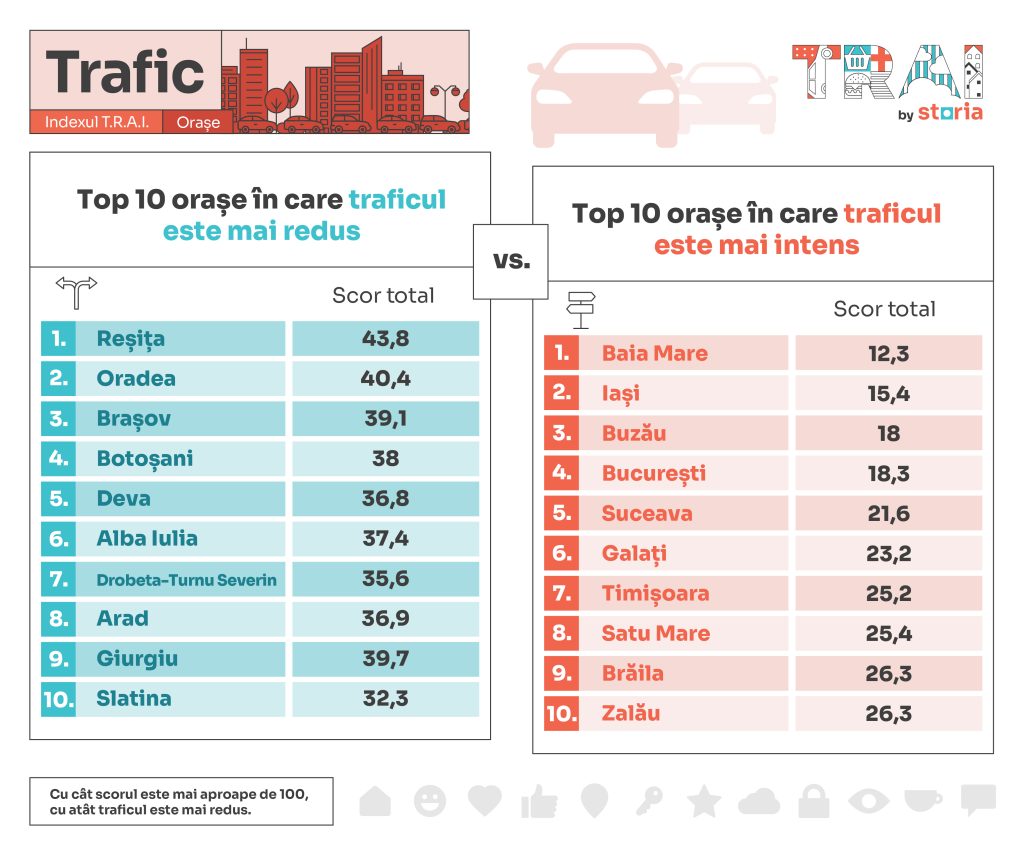 În prezent, Reșița, Oradea, Brașov, Botoșani și Deva sunt orașele din România cu traficul rutier cel mai redus, în timp ce la polul opus se află Baia Mare, Iași, Buzău, București și Suceava, unde traficul este cel mai intens comparativ cu cel din orașele analizate în cadrul indexului T.R.A.I., realizat de Storia – platforma cu anunțuri imobiliare lansată de OLX. La capitolul cartierelor cu cel mai redus trafic rutier se regăsește cartierul Recita din Reșița, cu un scor de 100 de puncte, singurul din platformă cu punctaj maxim. În ceea ce privește Capitala, cartierul cu cel mai redus trafic din București conform datelor platformei din acest moment este Pădurea Băneasa, cu un scor de 72,8 puncte.