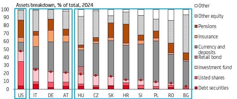 Gospodăriile din Europa Centrală și de Est demonstrează o abordare prudentă în ceea ce privește alocarea activelor, cash-ul și depozitele rămânând principalele lor active. Asta înseamnă că există posibilitatea unei diversificări mai mari, de exemplu, creșterea sumelor alocate către active de pe piața financiară, cum ar fi obligațiuni, acțiuni și fonduri.