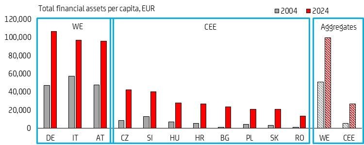 Studiul arată că averea financiară pe cap de locuitor a crescut de aproape cinci ori în ultimii douăzeci de ani în Europa Centrală și de Est, pe măsură ce economiile regiunii se apropie progresiv de cele din Europa de Vest. Comparativ, în țările din Europa de Vest, precum Germania, Italia și Austria vorbim doar de o dublare a acestui indicator. „Cu toate acestea, averea financiară pe cap de locuitor în Europa Centrală și de Est rămâne în jur de 30% din nivelul din Europa de Vest, ceea ce sugerează că există posibilitatea unei convergențe suplimentare semnificative.”, spune Mauro Giorgio Marrano, economist senior în Europa Centrală și de Est și unul dintre autorii studiului.