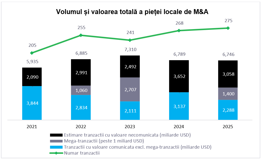 Piața românească de fuziuni și achiziții (M&A) a înregistrat o dinamică pozitivă în 2025, numărul tranzacțiilor crescând cu 3% față de anul anterior (YoY), până la 275 de tranzacții[1]. Nivelul de transparență a rămas redus, aproximativ 70% dintre tranzacții (192) neavând valoarea comunicată, o tendință constantă din 2022. Cu toate acestea, valoarea tranzacțiilor cu valoare comunicată a crescut cu 18% YoY, ajungând la 3,7 miliarde USD, susținută de trei tranzacții cu o valoare cumulată de 2,5 miliarde USD, inclusiv achiziția rețelei de sănătate Regina Maria pentru 1,4 miliarde USD. În ansamblu, valoarea totală estimată a pieței românești de M&A s-a menținut relativ stabilă, la 6,7 miliarde USD[2], pe fondul scăderii cu 17% YoY a valorii medii a tranzacțiilor cuprinse între 5 și 100 milioane USD, până la 19 milioane USD.
