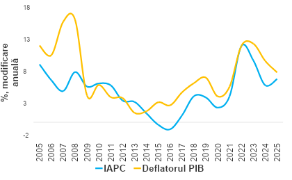 În figura de mai jos regăsim modificarea anuală a indicelui armonizat al prețurilor de consum sau a ratei inflației (conform statisticilor Eurostat, se raportează media anuală a indicelui IAPC lunar, deci modificarea acestuia reprezintă rata medie anuală a inflației), respectiv cea a deflatorului PIB. După cum se poate observa dintr-o simplă inspecție vizuală, dinamica anuală pentru cei doi indici a fost foarte apropiată în anumite perioade de timp, dar au existat și perioade caracterizate de decuplare semnificativă. Corelația dintre modificarea anuală a IAPC și cea a deflatorului PIB pentru perioada 2005-2025 este de aproximativ 72,3%, prin urmare una relativ ridicată. Observăm faptul că în perioada anterioară crizei financiare din 2008-2009, dinamica anuală a deflatorului PIB a fost sistematic și semnificativ peste cea a IAPC. Dacă ne uităm la perioada post-criză, adică perioada 2012-2025, corelația dintre cele două dinamici crește la aproximativ 85,4%. Pe de altă parte, dacă excludem perioada de după izbucnirea crizei pandemice și luăm în considerare perioada 2012-2019, corelația dintre variația anuală a IAPC și deflatorul PIB scade la aproximativ 67,1%. Prin urmare, legătura dintre variația anuală a IAPC și deflatorul PIB depinde de elemente precum fazele ciclurilor economice și financiare, natura șocurilor care afectează economia în ansamblu sau diferite măsuri în materie de politică monetară și fiscală. O variație anuală a deflatorului PIB peste cea a IAPC se traduce prin faptul că prețurile din întreaga economie cresc mai rapid decât cele din coșul de consum.