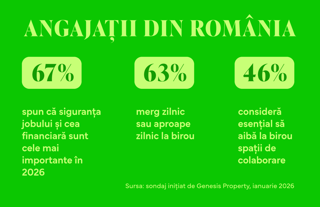 2026 a schimbat prioritățile angajaților români, în contextul economic și social actual, marcat de incertitudini și lipsă de predictibilitate. Pentru 67%, stabilitatea jobului și siguranța financiară sunt cele mai importante în acest an, înaintea flexibilității (44,8%) sau a echilibrului dintre viața la job și cea personală (42,9%), potrivit unui sondaj realizat de Genesis Property la începutul acestui an, pe un eșantion de 1.146 respondenți la nivel național. Ca urmare, peste 63% merg zilnic sau aproape zilnic la birou, în principal pentru a fi vizibili și a primi validări din partea managerilor pentru contribuția lor la activitatea companiei (42,1%), dar și pentru a se reconecta cu colegii (34,6%) și pentru a beneficia de învățare informală și transfer de cunoștințe de la membrii mai experimentați din echipă (30,6%).
