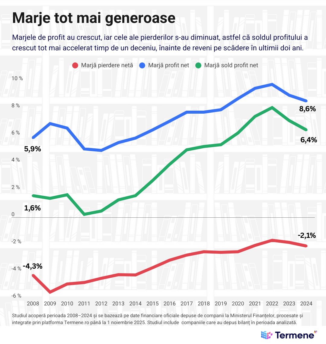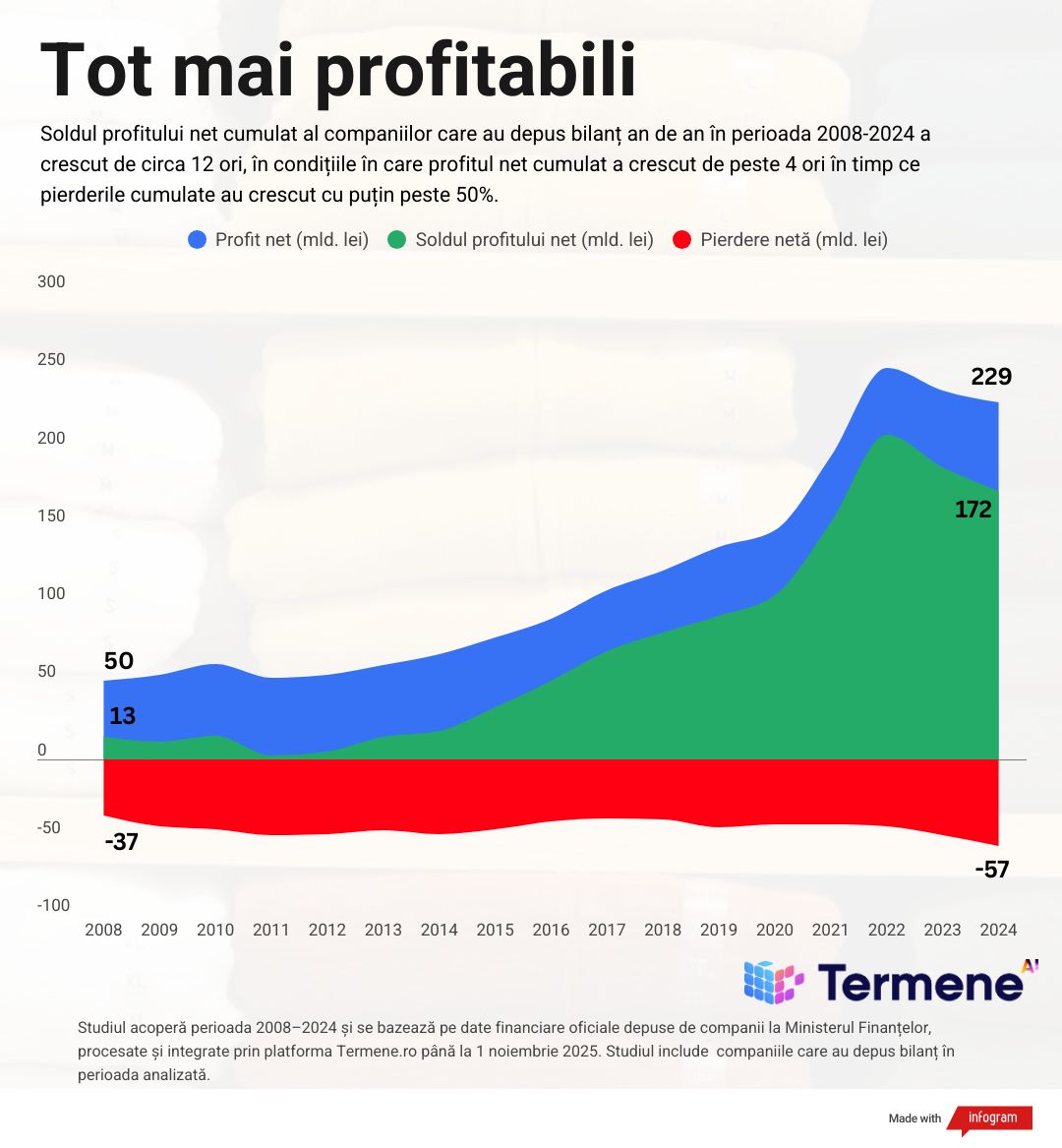 Un studiu amplu realizat de Termene.ro pe baza datelor financiare oficiale din perioada 2008-2024 arată transformarea profundă prin care a trecut mediul de afaceri din România în ultimul deceniu și jumătate. Cifra de afaceri cumulată a crescut de peste trei ori (de la 857 la 2.677 miliarde lei), profiturile nete s-au multiplicat de 4,5 ori (la 229 miliarde lei), iar raportul dintre profituri și pierderi a ajuns la un nivel record: peste 4 lei profit pentru fiecare 1 leu pierdere.