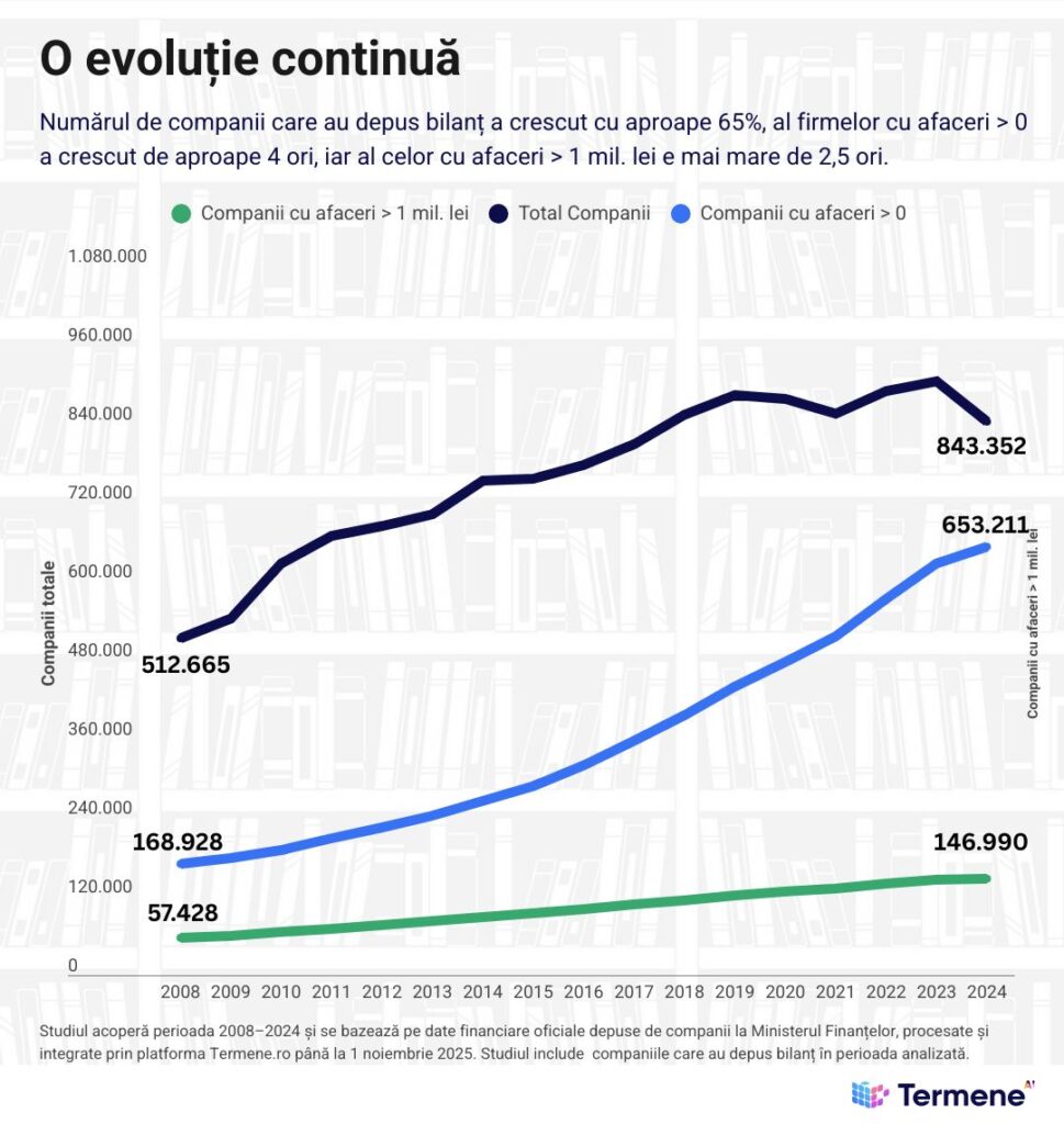Numărul companiilor active, care au depus bilanț, a crescut cu 65% în perioada 2008 – 2024, depășind în 2023 pragul de 900.000 de firme. Totodată, ponderea companiilor care generează efectiv venituri (cifră de afaceri de cel puțin 1 leu) a urcat de la 33% în 2008 la 77% în 2024 – un indicator cheie al maturizării mediului de afaceri. Segmentul companiilor cu afaceri de peste 1 milion de lei aproape s-a triplat, ajungând la 149.000 de entități.