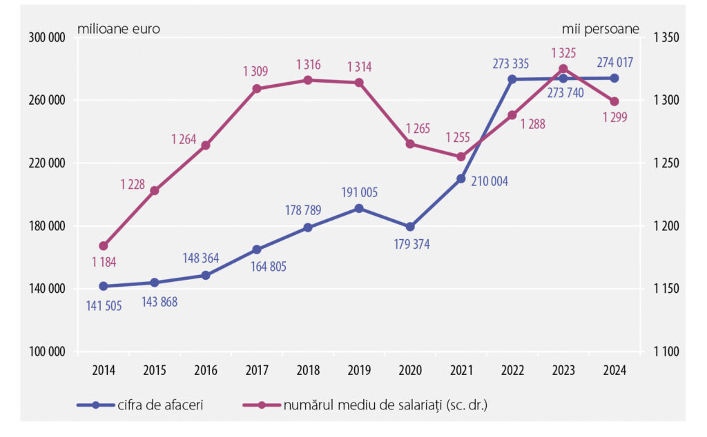 În perioada 2014-2024, „cifra de afaceri a crescut într-un ritm mult mai alert decât numărul mediu de salariați (+93,7 la sută față de +9,7 la sută), evidențiind preocuparea constantă a investitorilor străini pentru eficientizarea activității desfășurate în România”.