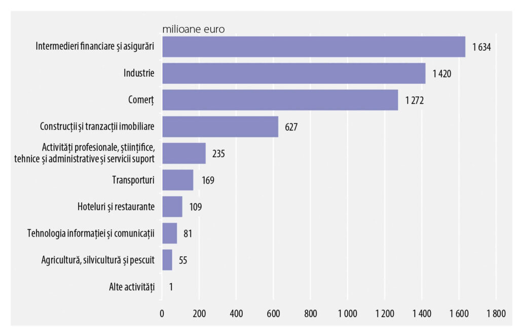 Profitul reinvestit s-a concentrat cu precădere în sectoarele intermedieri financiare și asigurări (1.431 milioane euro), comerț (776 milioane euro) și activități profesionale, științifice, tehnice și administrative și servicii suport (353 milioane euro).