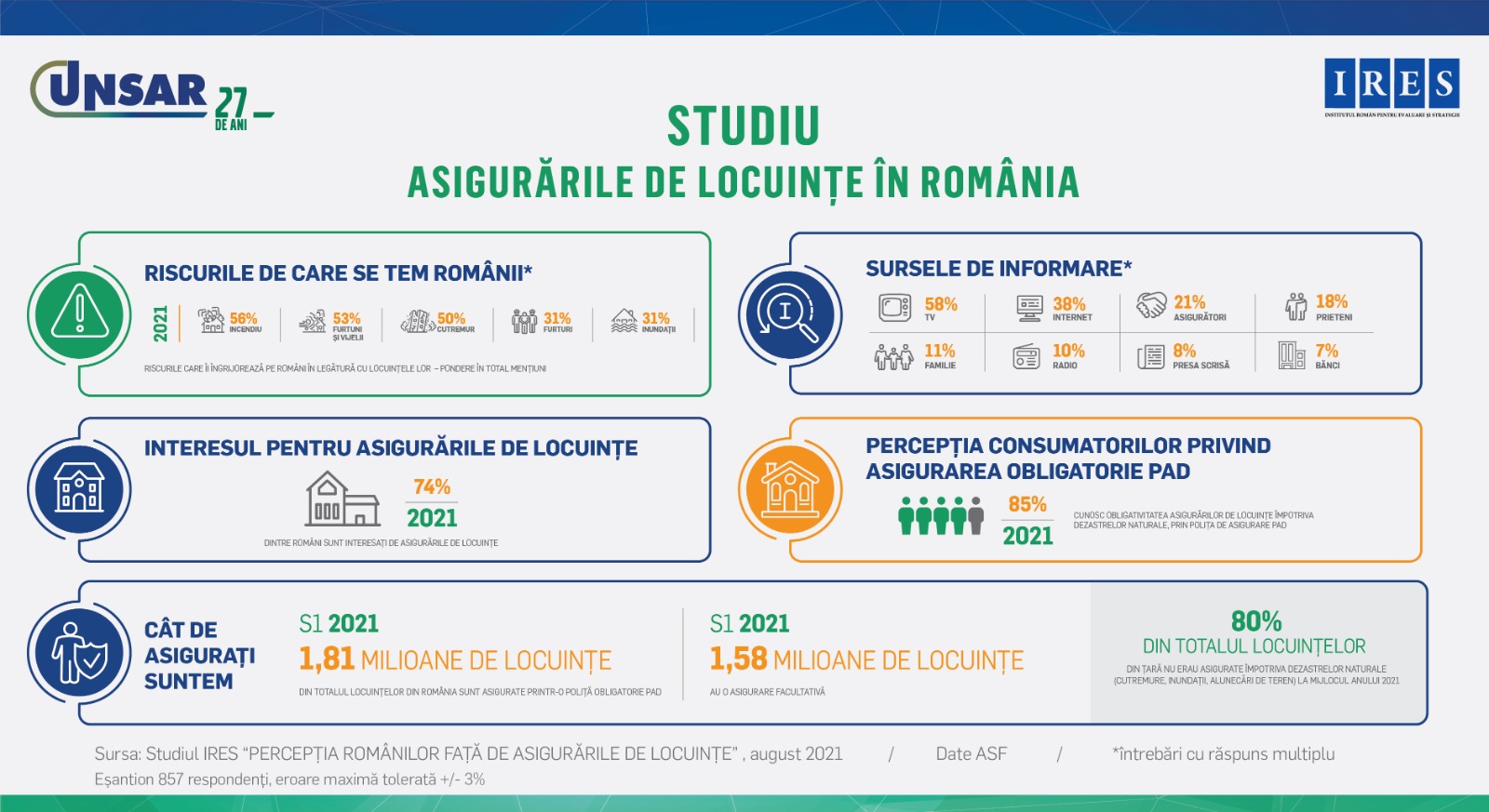 Sondajul “Percepția românilor față de asigurările de locuințe” a fost realizat de IRES, la solicitarea UNSAR, pe un eșantion reprezentativ la nivel național de 857 de respondenți, proprietari, coproprietari sau persoane care intenționează să achiziționeze o locuință în următorii doi ani, cu vârste de peste 18 ani. Acesta a fost realizat în august 2021, utilizând metodă CATI (Computer Assisted Telephone Interviewing), și are o eroare maximă tolerată de +/-3%.