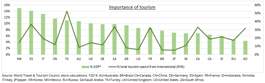 DISTRIBUIREA CIFRELOR: Cheltuielile pentru petrecerea timpului liber reprezintă 80% din totalul cheltuielilor pentru turism, restul fiind reprezentate de călătoriile de afaceri. În timp ce turismul intern reprezintă 70% din cheltuieli, restul este adus de turismul internațional. Acesta din urmă a fost afectat în special, cu scăderi de -70% anul trecut față de „numai” -45% în turismul intern. Țările mari cu expunere turistică (a se vedea graficul) sunt Mexic, Spania, Italia și China. Unele piețe mai mici au expunere și mai mare, turismul din Macao, Aruba și Maldive reprezentând peste 70% din PIB. Cele mai expuse țări la o revenire lentă în ce privește călătoriile internaționale sunt Spania, Turcia, Franța și Africa de Sud.